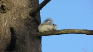 We deduced that there seemed to be roughly one conspicuous white for every three common grays. Watching the little white acrobats, we noticed things about squirrel behavior we’d never seen before. And we speculated that probably all squirrels do these things, but we were only just now noticing them because the white specimens stand out so much from their environment – and loom so large in our imaginations.