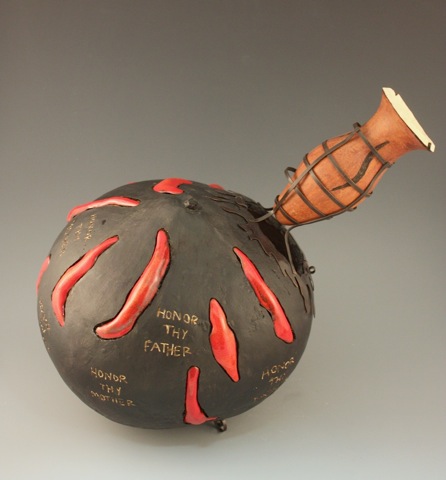 Cindi: My first theme or thing that I felt compelled to say in artistic form was in metal combined with gourds, organic objects that represented the human form. I was going through an intense, emotionally exhausting and draining custody issue with my husband (concerning his ex-wife) during the years I was getting my BFA from EKU. His son, who is now, seventeen, was seven and a half when I met him. He is an only child. The effect of being in the middle of two adults who were angry at each other was painfully obvious. I was appalled at the behavioral changes we saw in him as he tried to cope. Watching a child suffer when one parent willfully manipulated his natural feelings towards both parents in order to gain a legal advantage was something I never contemplated being involved with in my lifetime. Basically, parental alienation is a form of emotional abuse, as it asks the child to give up their natural love for a parent in order to make another parent happy. It’s about exploitation of power relationships of parent and child, and development of co-dependency. Eventually, you hope, depending on the kid, that they figure out what’s going on, and a lot of kids do, but it’s at the cost of a wound that can take a lifetime to heal. In our case, my stepson is on a path of awareness, now, so that’s good for him. I’m sure I’ll find some way of expressing this “turning of a corner.” Needs time to ferment.