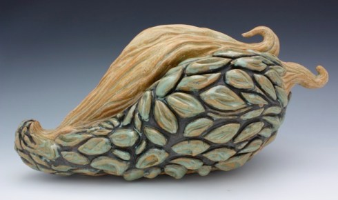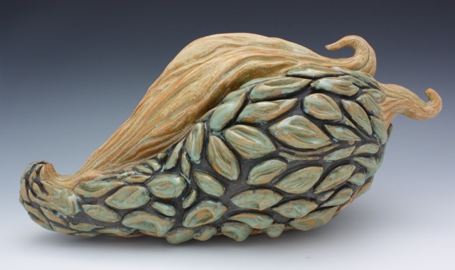 Cindi: A visiting artist to EKU once said to me, “If it comes from your hands, it’s good.” English wasn’t her first language so she may have wanted to be more elaborate, but the simplicity of what she did say had such a profound effect on my work. I went from simple gourd forms in clay to bending the form and finally, my carving exploded. I stopped planning what I was going to do and trying to get my hand work to match the expectations in my head. As a result, I was able to let go and just let my hands do their thing and then stop and look at what I had created. I began a dialogue with myself about what I was trying to say to me. I became my own best feedback. I let my intuition guide me and then tweaked and guided it to help express what I was trying to say. In effect, I let go of my artistic control freak that had been holding me back.