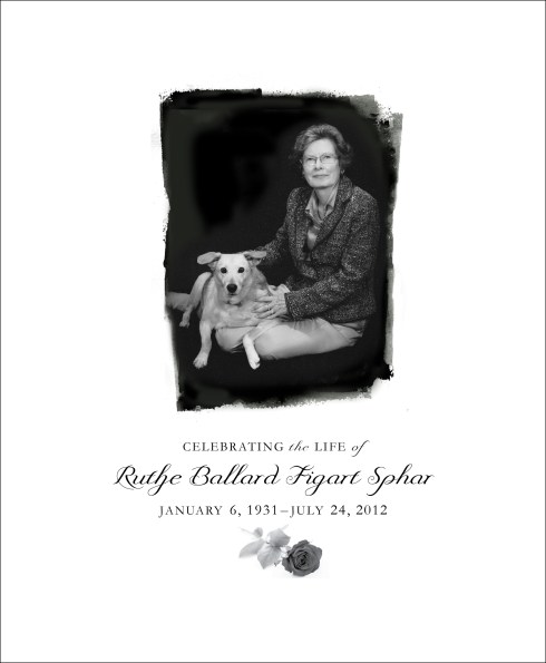 Ruthe never lost her sharp mind, offbeat sense of humor or “the-show-must-go-on” poise. Whenever she became bored with crossword puzzles and Neiman Marcus catalogs, Mom would gaze resolutely at me or Paula and say, “Let’s roll.” We’d get her into the small transport chair and she would pedal along as we rolled around the house–first to the screened-in back porch to see her squirrels, rabbits, finches, woodpeckers, hummingbirds, cardinals, wrens and blue jays; her roses, crape myrtles, hydrangeas, herbs and tomatoes on the vine. Next she’d visit favorite books in the library, gleefully wake the cats from their naps, watch fervently from the front door as we went to retrieve her abundant mail, and sometimes she would play hymns on her piano, as she always had, by ear.